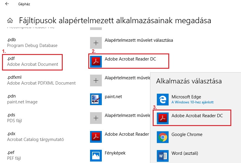 4. Az új ablak bal oldali sávjában keressük meg a .pdf fájltípust és ellenőrizzük, hogy az Adobe Acrobat Reader az alapértelmezett program ehhez a fájltípushoz. Ha nem, akkor a 2. számmal jelölt sorra kattintva a megjelenő ablakból válasszuk ki.